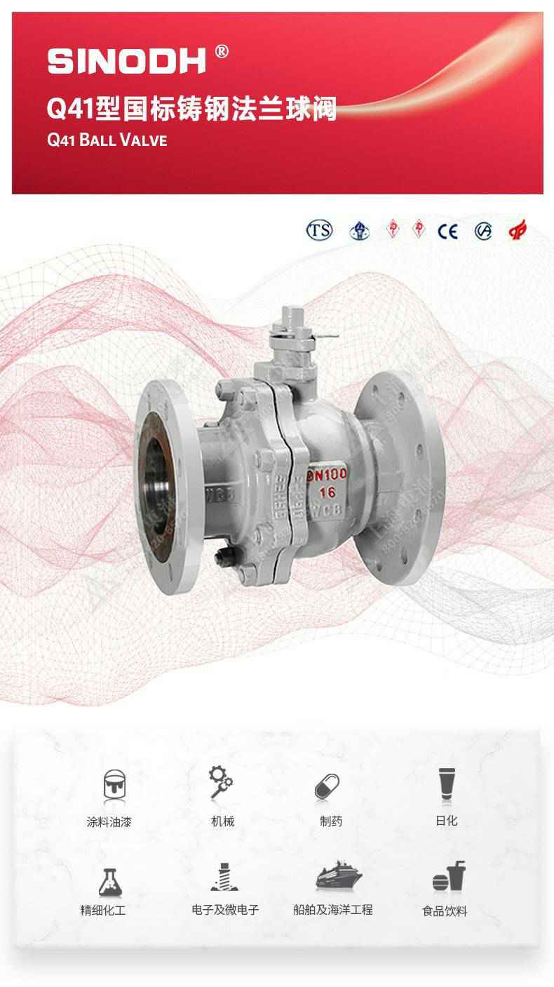 Q41型国标铸钢法兰球阀,为扬州绍辉电子元器件供应有限公司自主研发生产。本产品设计制造标准符合GB/T12237、GB/T12224标准。该产品的球体在介质压力作用下球体能产生一定的位移并紧压在出口端的密封面上,保证出口端密封。适用于水、溶剂、酸和天然气等一般工业介质也适用于工况恶劣的介质,如氧气、过氧化氢、甲烷和乙烯等介质。